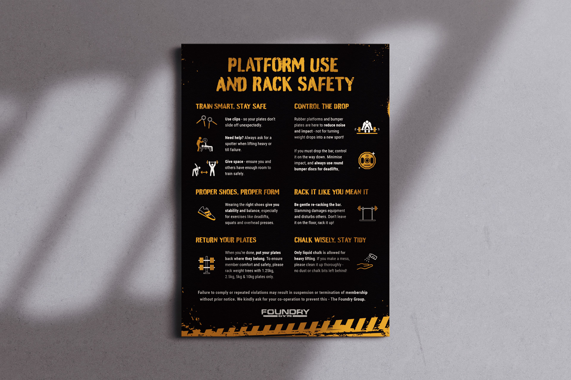 This design helps maintain a safe and efficient environment while seamlessly blending with The Foundry's clean and bold aesthetic. I introduced icons to aid the clear messaging.